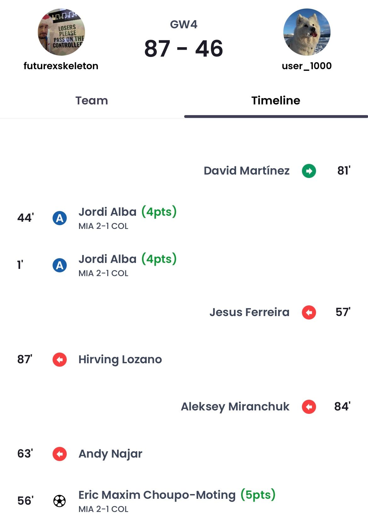 Match events such as goals, assists and red cards are now logged in chronological order in the Points page (see the ‘Team’ and ‘Timeline’ tabs).